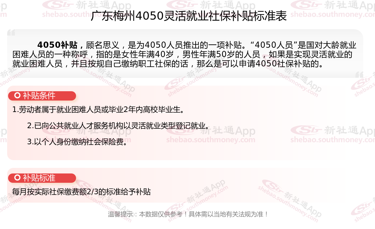 二、广东梅州4050社保补贴多少钱一个月?广东梅州4050社保补贴2025年最新标准是多少?