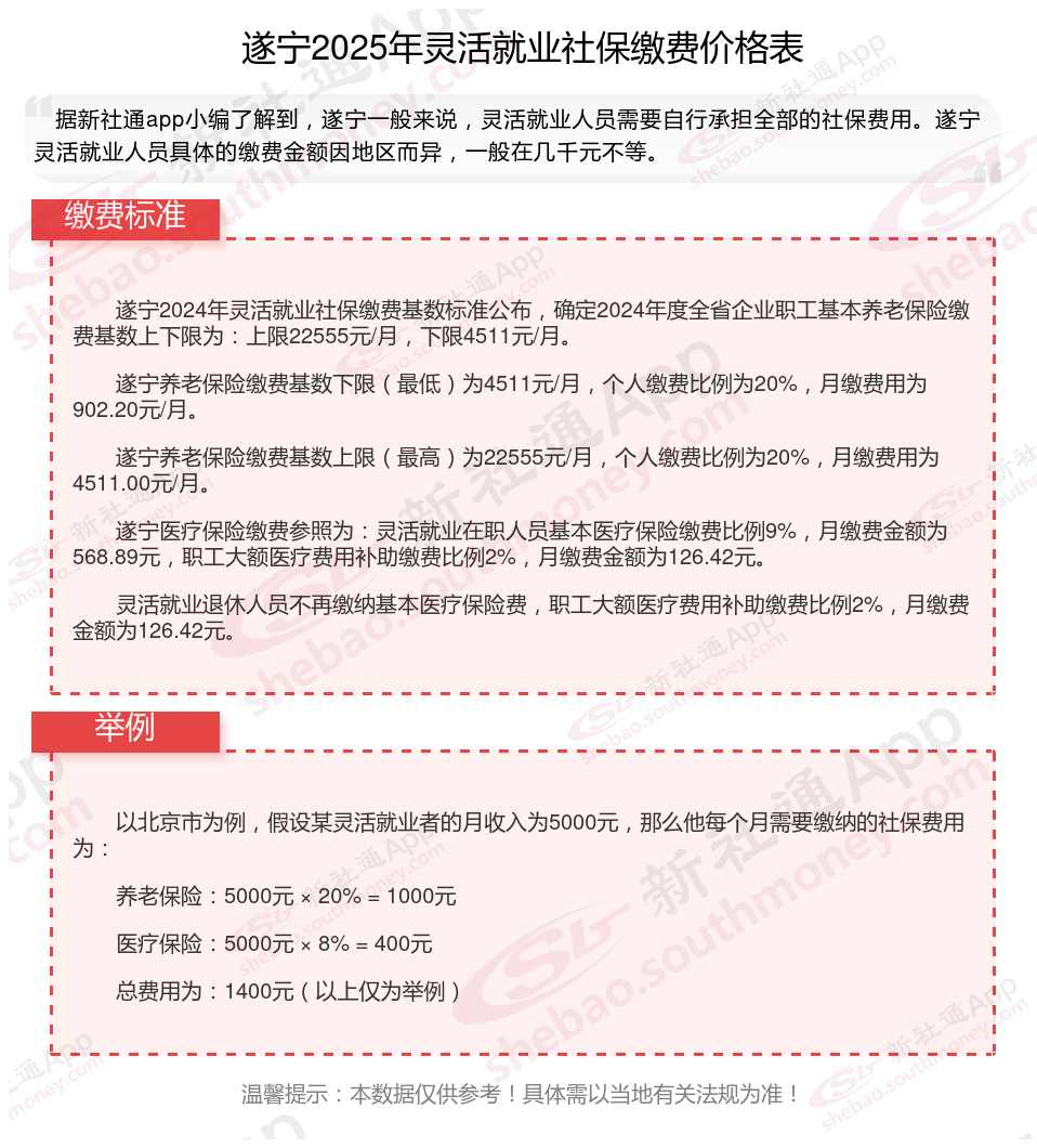 据新社通app数据显示,遂宁灵活就业人员养老保险缴费基数2024-2025年最新标准如下:
