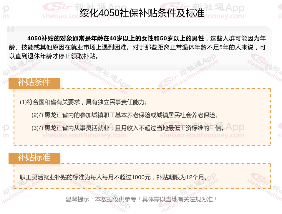 二、2025年绥化4050社保补贴标准是多少?领取条件是什么?