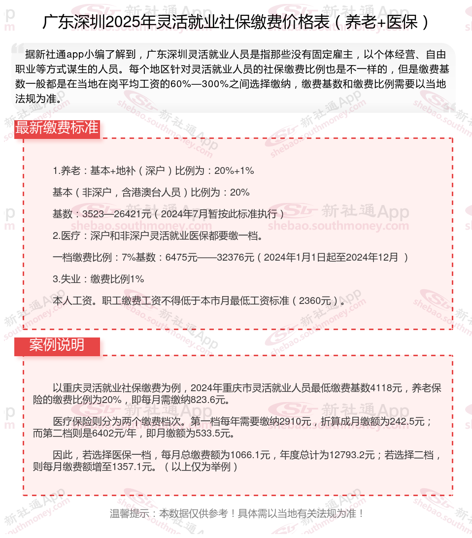 据新社通app数据显示,广东深圳灵活就业养老保险的缴费基数为:3523元。灵活就业人员参保缴费的比例为个人20%。