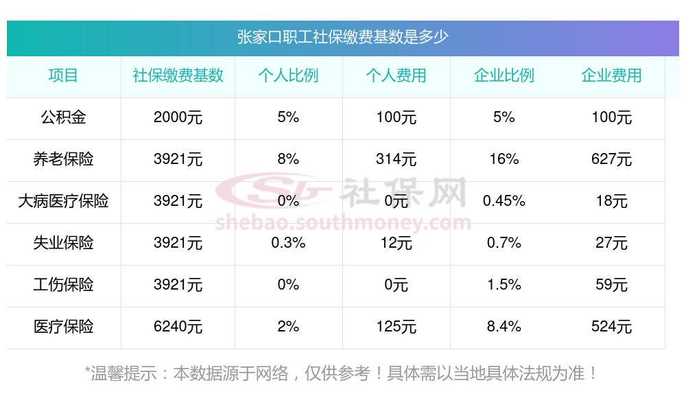 张家口缴费社保比例一览 社保公司和个人各交多少?下表是2024-2025年张家口社保费用明细参考,新社通app-社保缴费查询工具提供的最新数据如下: