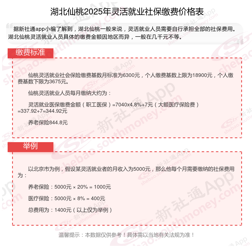 那么,湖北仙桃个体户社保一个月需要交多少钱?根据新社通app-社保缴费查询工具提供的2025社保缴费标准详情数据: