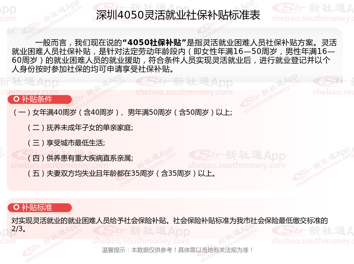 今天聊一下4050补贴话题。4050补贴听起来像是一个针对特定年龄人群的社保补贴。比如女性需年满40周岁,男性需年满50周岁(以申请当年12月31日为截止日期)。那么深圳4050灵活就业社保补贴标准是多少钱?深圳4050社保补贴条件是什么?接下来随新社通APP小编了解一下最新资讯。