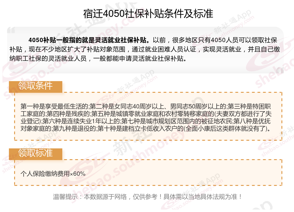 一、2023-2024年宿迁4050社保补贴标准及条件是多少?
