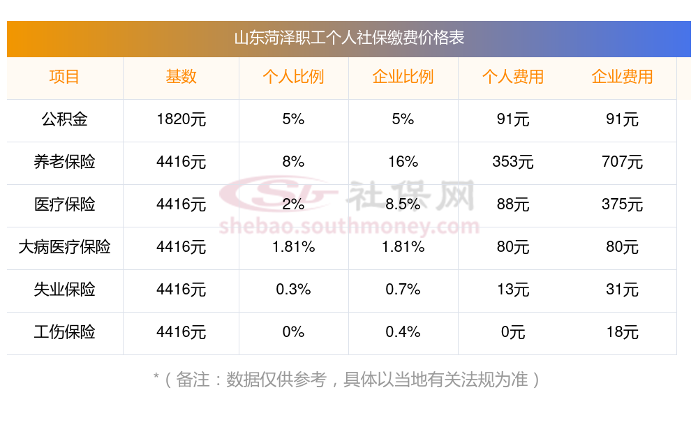 山东菏泽缴费社保比例一览 社保公司和个人各交多少?下表是2024-2025年山东菏泽社保费用明细参考,新社通app-社保缴费查询工具提供的最新数据如下: