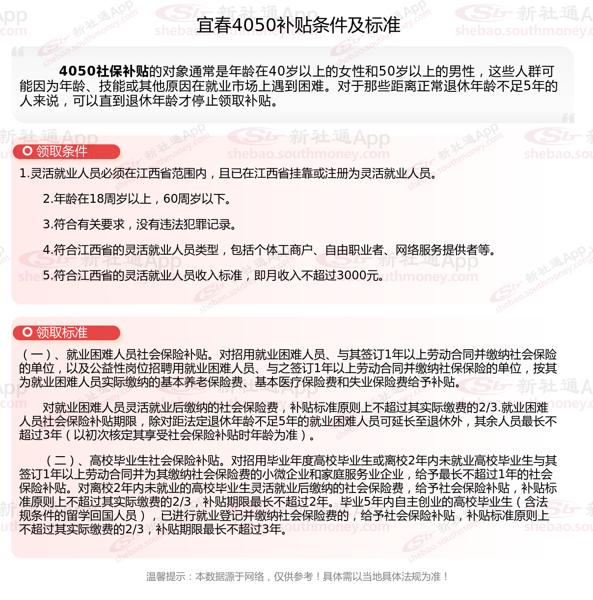 二、2025年宜春4050社保补贴标准及条件,最新如下: