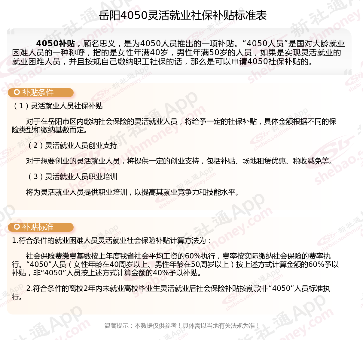 岳阳4050灵活就业社保补贴是什么?今天聊一下4050补贴话题。4050补贴听起来像是一个针对特定年龄人群的社保补贴。比如女性需年满40周岁,男性需年满50周岁(以申请当年12月31日为截止日期)。那么岳阳4050灵活就业社保补贴标准是多少钱?岳阳4050社保补贴可以领取多少?接下来随新社通APP小编了解一下岳阳4050灵活就业社保补贴的最新资讯。