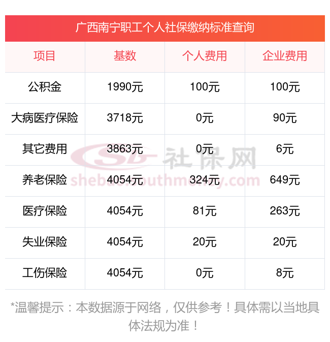 2025年广西南宁社保缴费多少钱?广西南宁社保公积金缴费基数为:3579.00元,个人比例:0.08,下表是2025广西南宁社保费用明细参考,新社通app-社保缴费查询工具提供的最新数据如下: