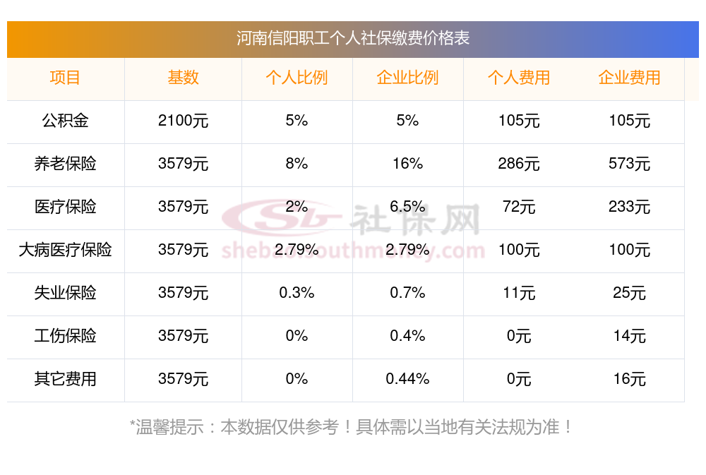 2025年河南信阳社保缴费标准是多少,农村社保要交多少年 下表是2025年河南信阳社保费用明细参考,新社通app-社保缴费查询工具提供的最新数据如下: