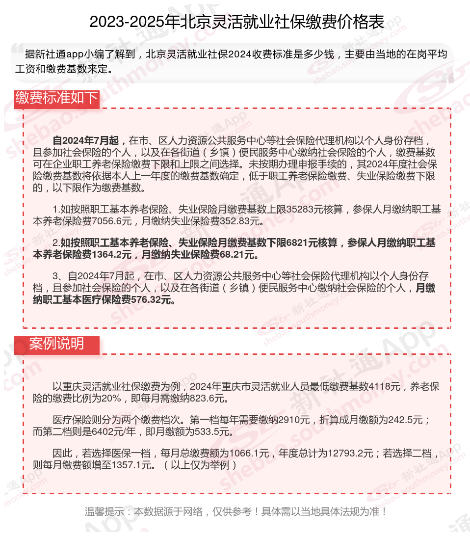 据新社通app数据显示,北京灵活就业人员养老缴费基数2024-2025年最新标准如下:
