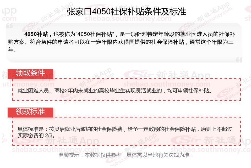 二、张家口4050社保补贴标准及条件(2025年最新)