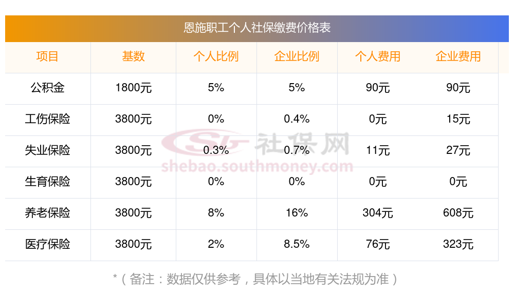 湖北恩施缴费社保比例一览 社保公司和个人各交多少?下表是2024-2025年湖北恩施社保费用明细参考,新社通app-社保缴费查询工具提供的最新数据如下: