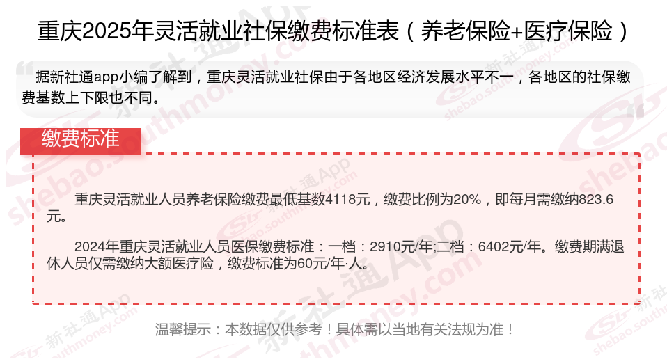 重庆灵活就业社保2025年收费标准是多少钱,主要由当地的在岗平均工资和缴费基数来定。其次,灵活就业社保缴纳跟职工缴纳不同的地方在于,灵活就业社保参保只能参保养老保险和医疗保险,且缴纳比例完全由个人承担。另外,灵活就业人员社保参保选择,可自由选择参保城镇职工社保和城乡居民保险。2025年重庆灵活就业社保缴多少钱?如何缴纳?怎么计算待遇?新社通APP小编将在下文为您详细说明。