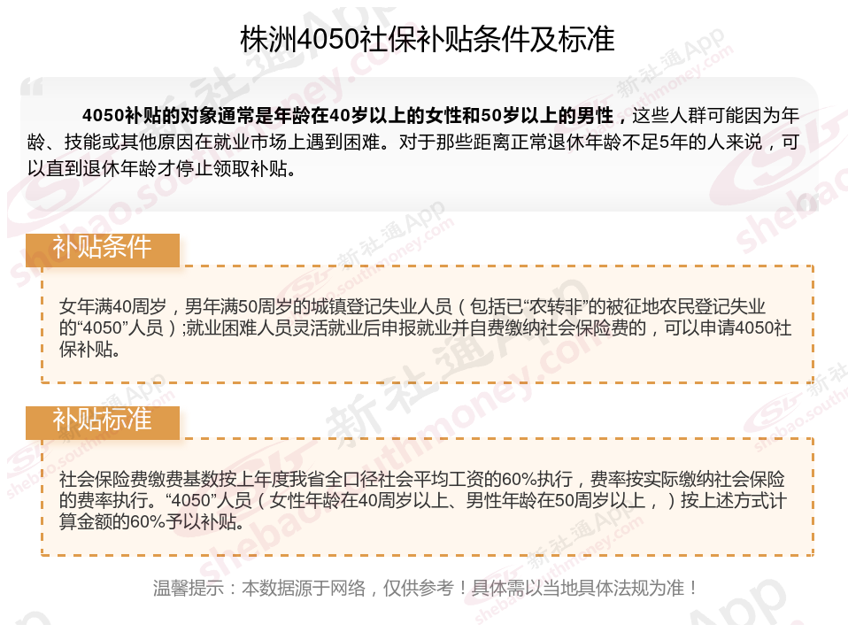 4050社保补贴标准据新社通app小编了解,通常,4050社保补贴包含基本医疗保险和基本养老保险两个险种,社保补贴金额为申请人实际缴纳基本养老保险和基本医疗保险金额的2/3,具体标准以当地社保局公布的数据为准!那么株洲4050灵活就业困难人员社保补贴标准是多少?株洲4050社保补贴需要符合什么条件?接下来随新社通APP小编具体了解一下4050社保补贴内容。