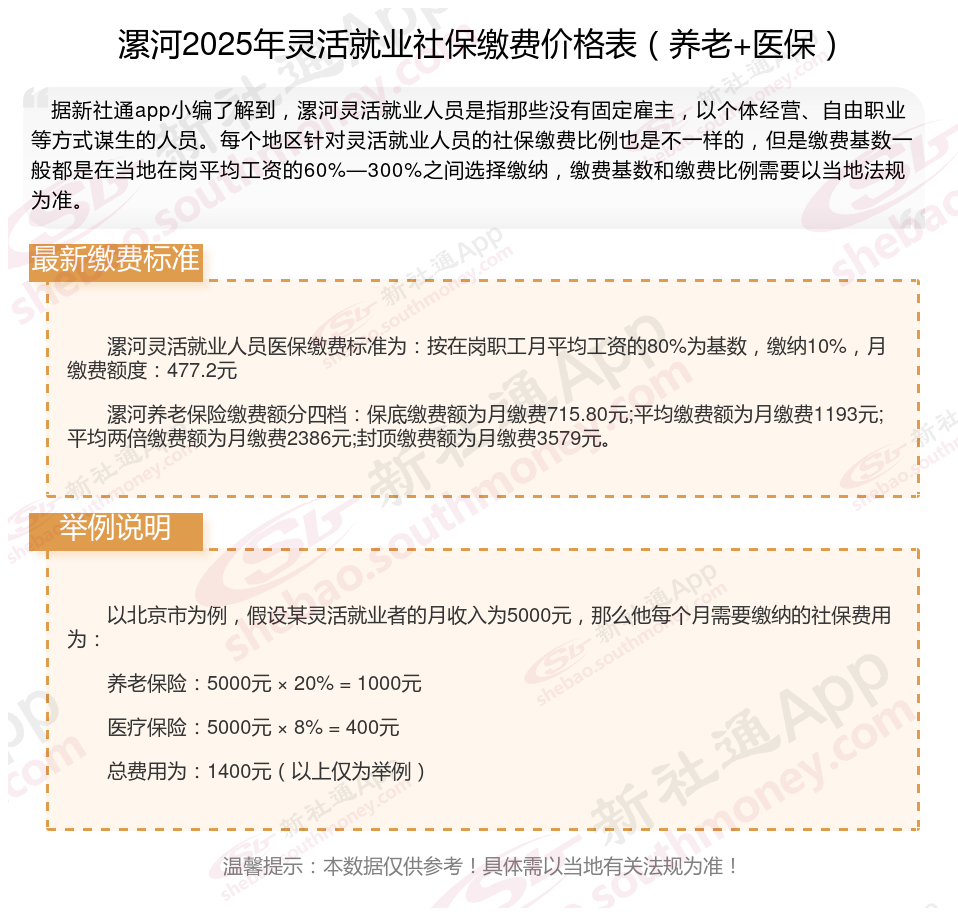 漯河社保缴费多少钱?下表是2024-2025年漯河社保费用明细参考,根据新社通app-社保缴费查询工具提供的最新数据如下: