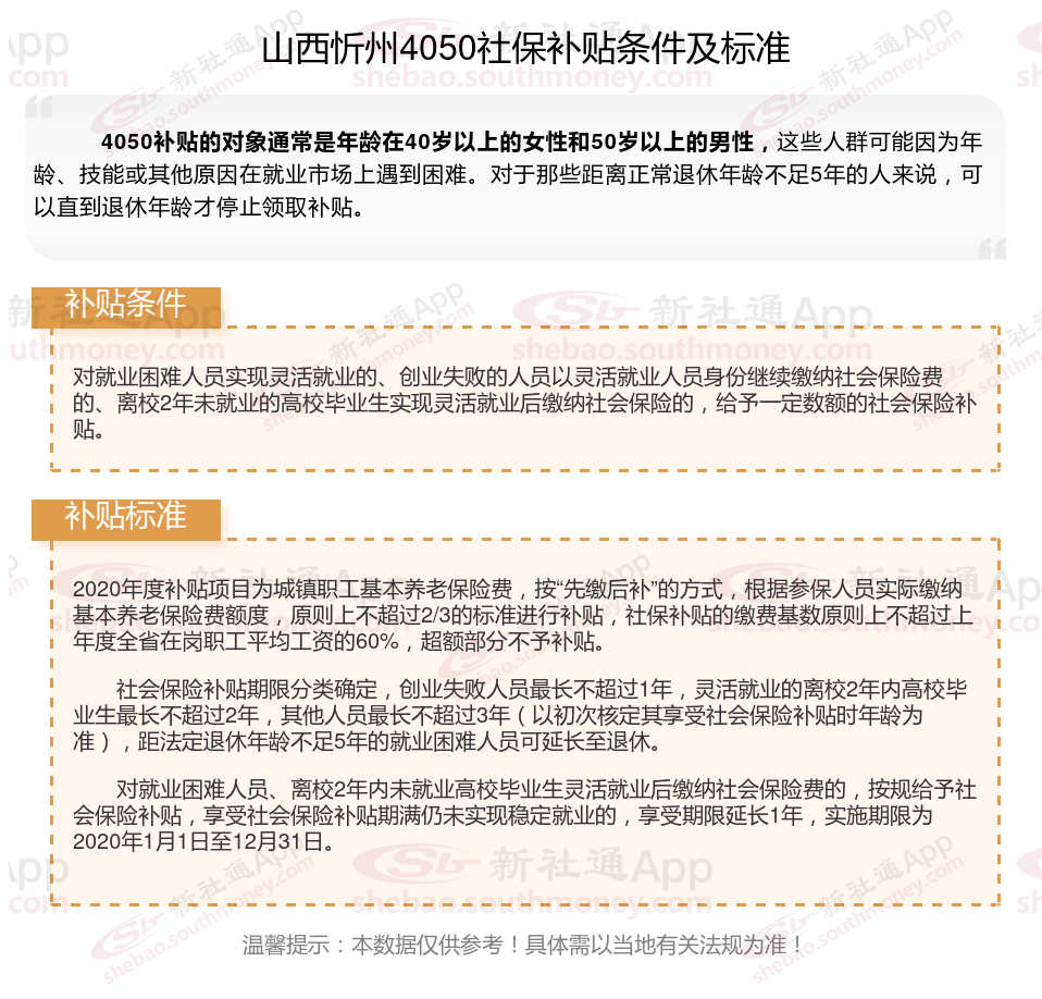 一、2025年山西忻州4050社保补贴标准是怎么样的,附领取条件