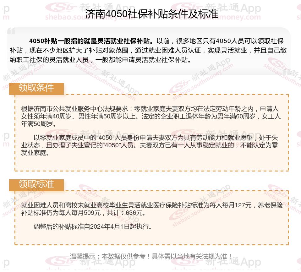 “4050人员”是国对大龄就业困难人员的一种称呼,指的是女性年满40岁,男性年满50岁的人员,那么济南4050灵活就业社保补贴标准是多少钱?济南4050社保补贴条件是什么?接下来随新社通APP小编了解一下最新资讯。