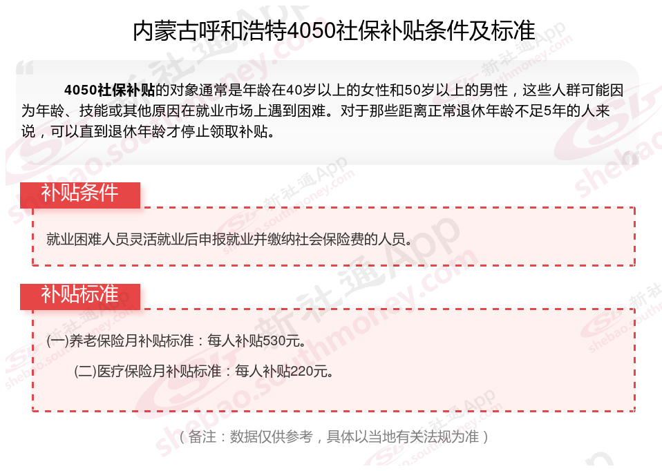 二、内蒙古呼和浩特4050社保补贴标准及条件4050社保补贴,最新如下