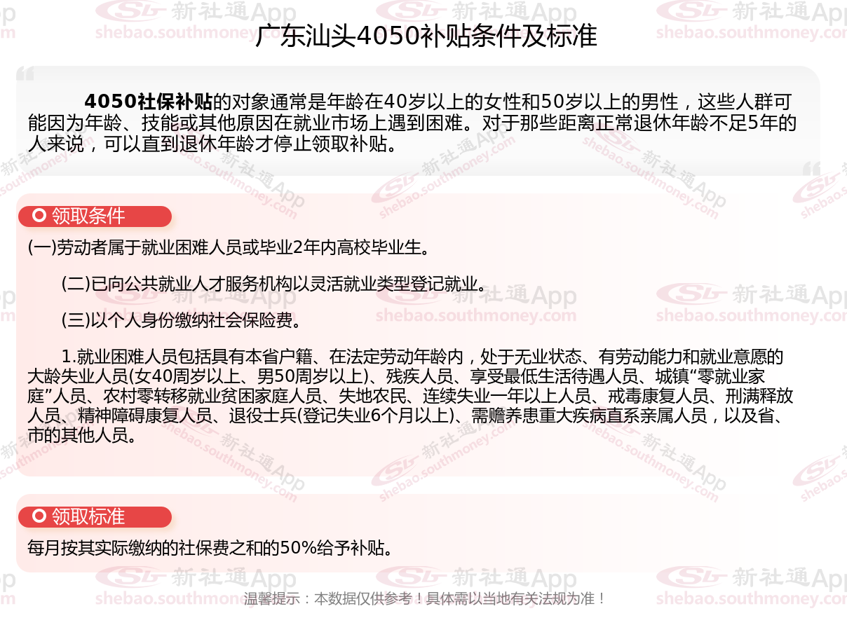 一、2023-2024年广东汕头4050社保补贴标准及条件是多少?