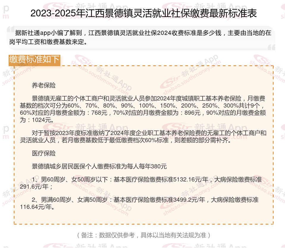 江西景德镇灵活就业人员的社保缴费标准是多少?根据新社通app-社保缴费查询工具提供的最新数据如下: