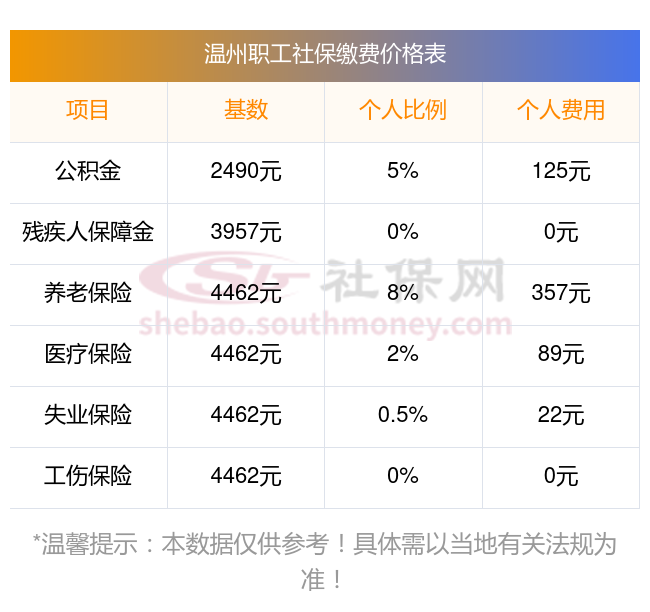 2025年温州社保缴费价格,2025年温州社保缴费多少钱?下表是2025年温州社保费用明细参考,新社通app-社保缴费查询工具提供的最新数据如下: