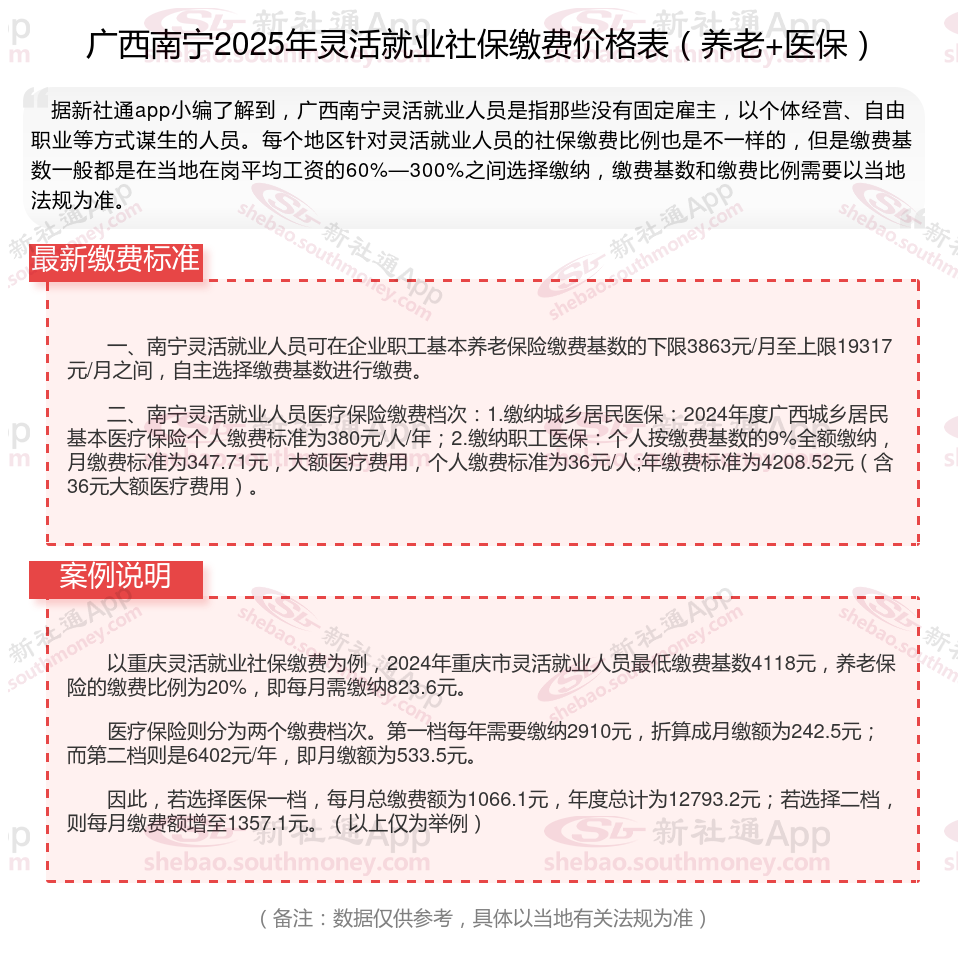 那么,广西南宁自由职业社保一个月需要交多少钱?根据新社通app-社保缴费查询工具提供的2025社保缴费标准详情数据: