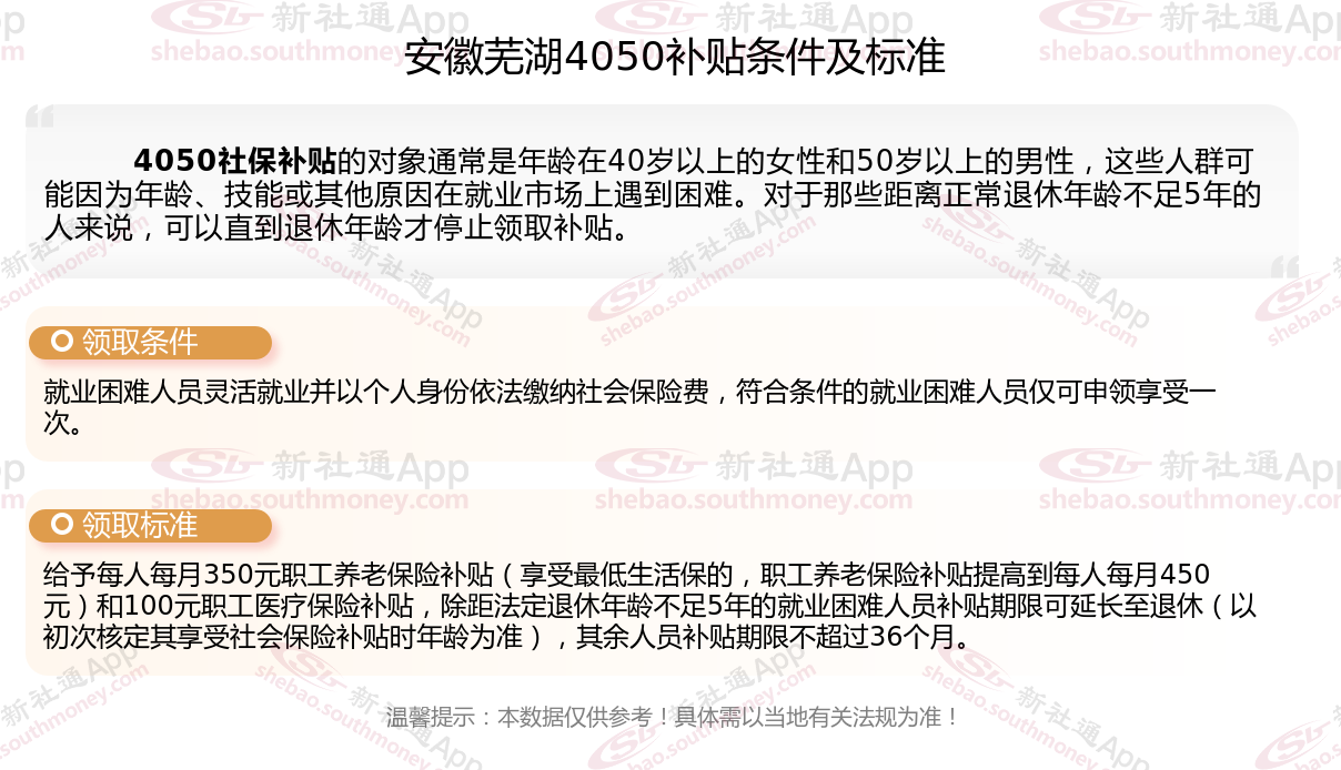 一、安徽芜湖4050社保补贴标准及条件2025年最新消息