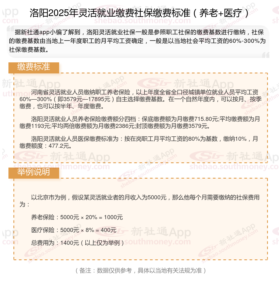 据新社通app数据显示,洛阳灵活就业养老保险的缴费基数为:3579元。灵活就业人员参保缴费的比例为个人20%。
