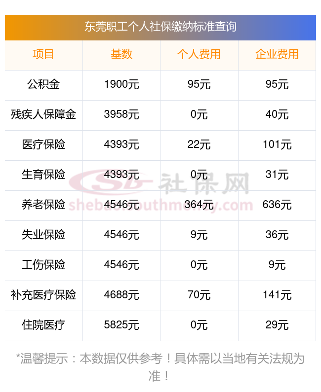2025年东莞社保缴费多少钱?下表是2024-2025年东莞社保费用明细参考,新社通app-社保缴费查询工具提供的最新数据如下: