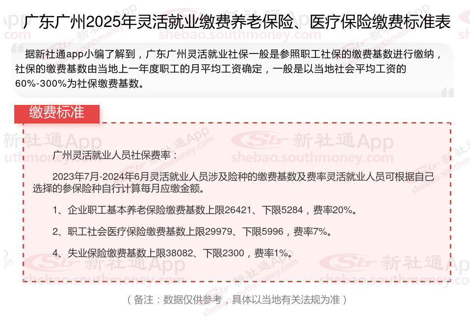 据新社通app数据显示,广东广州灵活就业人员养老保险缴费基数2024-2025年最新标准如下: