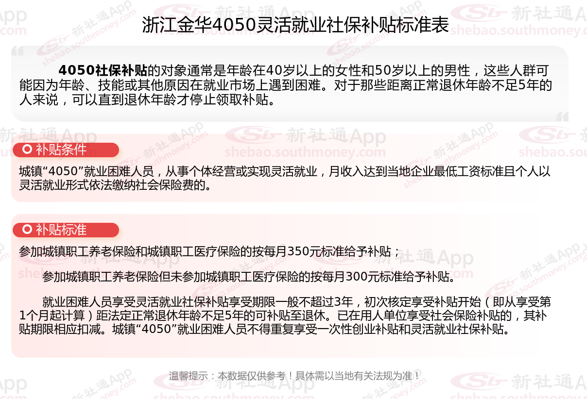 4050补贴需要以灵活就业身份参加职工养老和医疗保险,补贴标准不超过实际缴费的三分之二,最长3年,距离退休不足5年的可延长到退休。补贴对象包括国企下岗人员、低保家庭等。申请流程需要提交身份证、银行账户等。那么浙江金华4050灵活就业社保补贴标准是多少钱?浙江金华4050社保补贴条件是什么?接下来随新社通APP小编了解一下最新资讯。