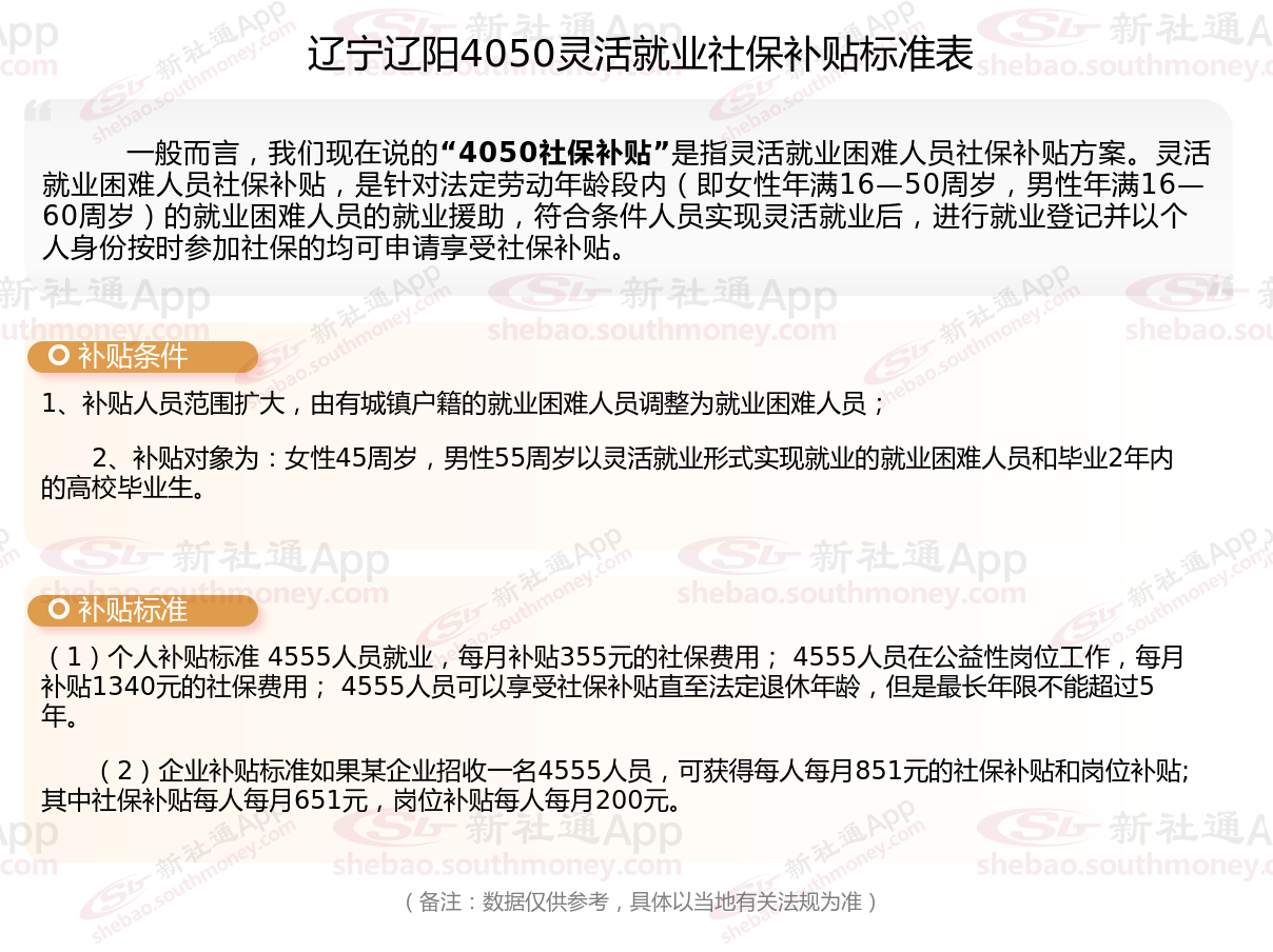 辽宁辽阳4050灵活就业社保补贴是什么?今天聊一下4050补贴话题。4050补贴听起来像是一个针对特定年龄人群的社保补贴。比如女性需年满40周岁,男性需年满50周岁(以申请当年12月31日为截止日期)。那么辽宁辽阳4050灵活就业社保补贴标准是多少钱?辽宁辽阳4050社保补贴可以领取多少?接下来随新社通APP小编了解一下辽宁辽阳4050灵活就业社保补贴的最新资讯。