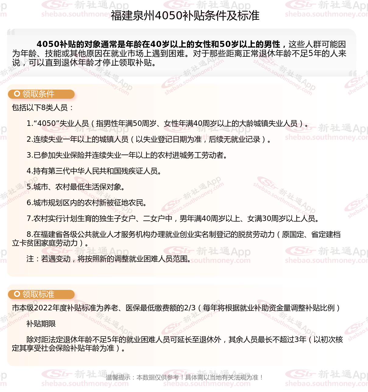多数地区只有4050人员可以领取社保补贴,现在扩大了补贴对象及范围,通过就业困难人员认证,实现灵活就业,并且自己缴纳职工社保的灵活就业人员,一般都能申请灵活就业社保补贴。那么福建泉州4050灵活就业社保补贴标准是多少钱?福建泉州4050社保补贴条件是什么?接下来随新社通APP小编了解一下最新资讯。