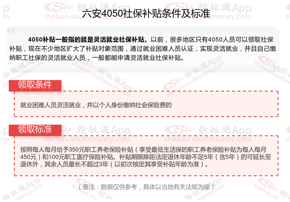 4050补贴需要以灵活就业身份参加职工养老和医疗保险,补贴标准不超过实际缴费的三分之二,最长3年,距离退休不足5年的可延长到退休。补贴对象包括国企下岗人员、低保家庭等。申请流程需要提交身份证、银行账户等。那么六安4050灵活就业社保补贴标准是多少钱?六安4050社保补贴条件是什么?接下来随新社通APP小编了解一下最新资讯。