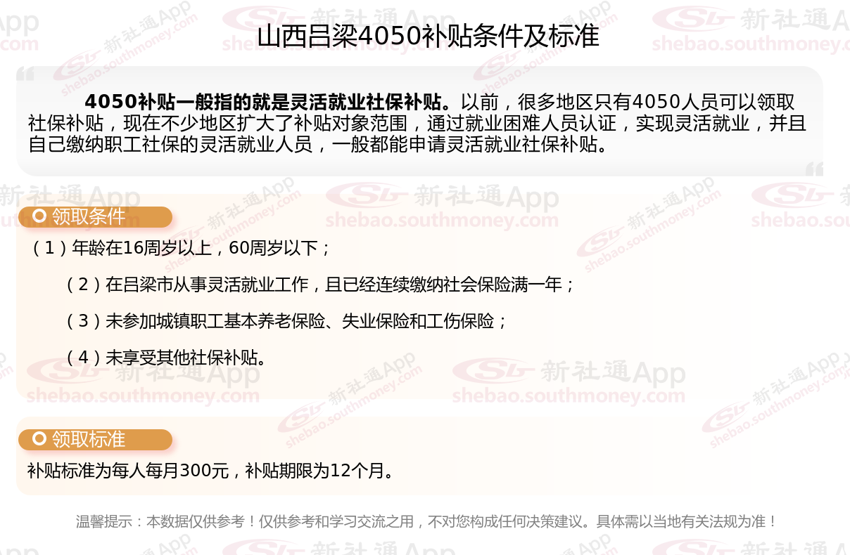 “灵活就业4050社保补贴”需要以灵活就业身份参加职工养老和医疗保险,补贴标准不超过实际缴费的三分之二,最长3年,距离退休不足5年的可延长到退休。补贴对象包括国企下岗人员、低保家庭等。申请流程需要提交身份证、银行账户等。那么山西吕梁4050灵活就业困难人员社保补贴标准是多少?山西吕梁4050社保补贴需要符合什么条件?接下来随新社通APP小编具体了解一下4050社保补贴内容。
