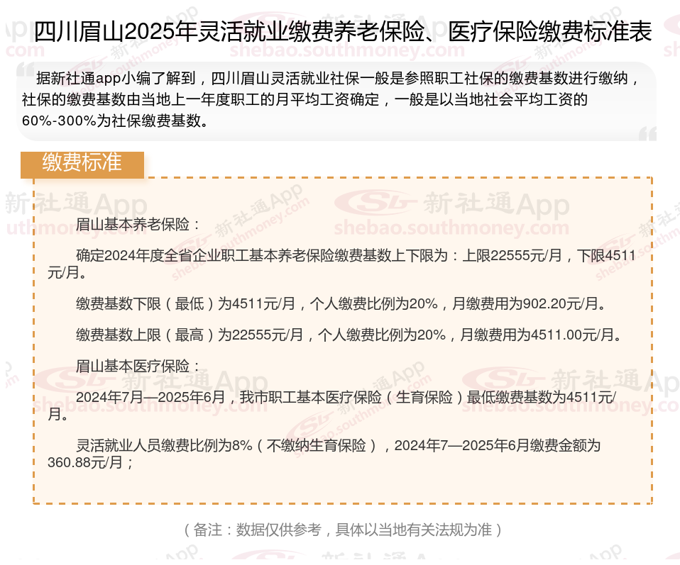据新社通app数据显示,四川眉山灵活就业养老保险的缴费基数为:4511元。灵活就业人员参保缴费的比例为个人20%。