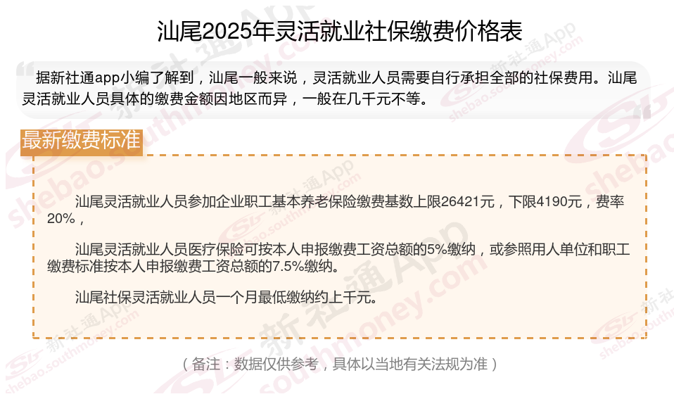 那么,灵活就业者社保是多少钱一个月 汕尾灵活社保交多少钱?根据新社通app-社保缴费查询工具提供的2025社保缴费标准详情数据: