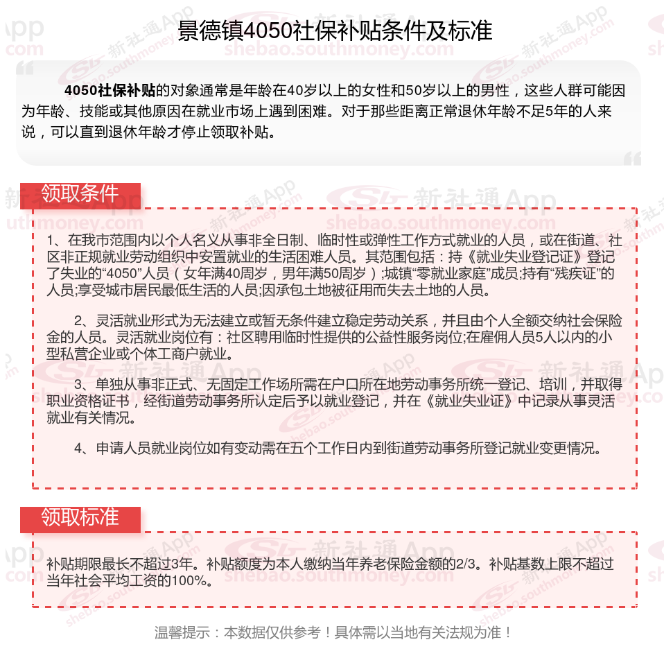 景德镇4050灵活就业社保补贴标准如何?“4050补贴”主要是针对大龄就业困难人群的社保补贴,申请条件包括年龄、就业困难、灵活就业并自费缴纳社保,需要持有失业登记证,不同地区可能有细微差别,比如农村户口的限制。那么景德镇4050灵活就业社保补贴标准是多少钱?景德镇4050社保补贴条件是什么?接下来随新社通APP小编了解一下景德镇4050灵活就业社保补贴标准最新资讯。