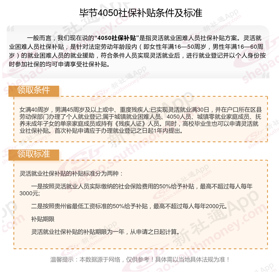 毕节4050灵活就业社保补贴标准如何?“4050补贴”主要是针对大龄就业困难人群的社保补贴,申请条件包括年龄、就业困难、灵活就业并自费缴纳社保,需要持有失业登记证,不同地区可能有细微差别,比如农村户口的限制。那么毕节4050灵活就业社保补贴标准是多少钱?毕节4050社保补贴条件是什么?接下来随新社通APP小编了解一下毕节4050灵活就业社保补贴标准最新资讯。