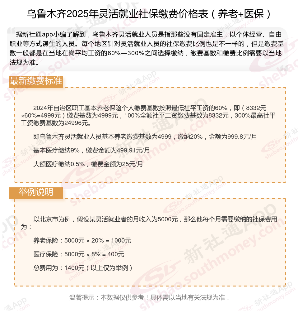 三、乌鲁木齐2025年灵活就业社保缴费基数及比例最新消息
