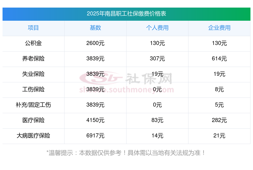 2025年南昌社保缴费多少钱?南昌社保公积金缴费基数为:3579.00元,个人比例:0.08,下表是2025南昌社保费用明细参考,新社通app-社保缴费查询工具提供的最新数据如下: