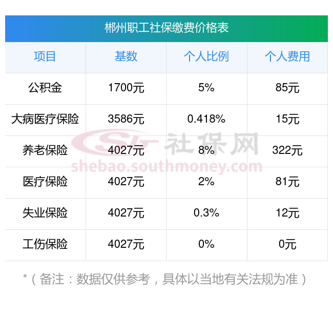 2025年郴州社保缴费价格,2025年郴州社保缴费多少钱?下表是2025年郴州社保费用明细参考,新社通app-社保缴费查询工具提供的最新数据如下:
