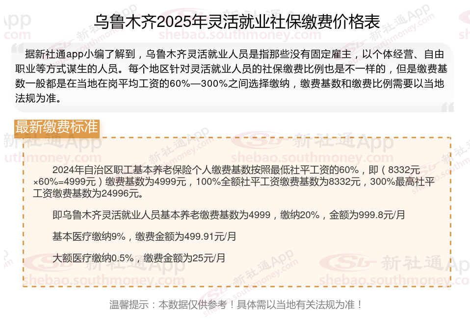 灵活就业社保通常只需缴纳养老和医疗两项(部分地区可自愿选缴失业险),其他险种无需强制缴纳。灵活就业社保缴费满15年后,退休后可领取养老金,避免老年无收入来源。那么2025年乌鲁木齐灵活就业人员社保需要交多少钱?下面随新社通小编一起来看看。