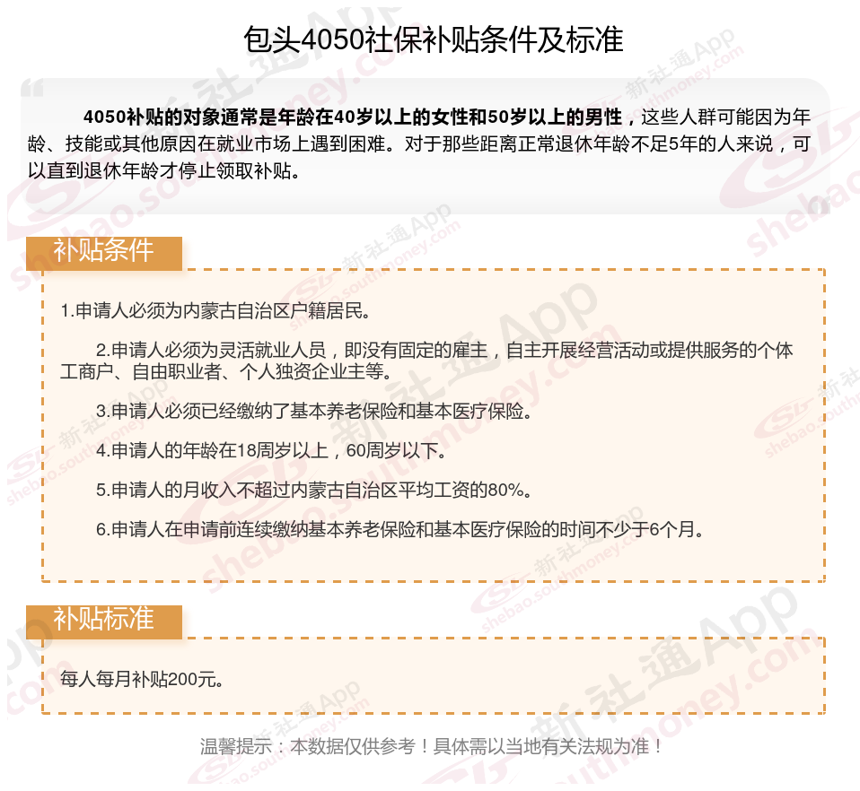 二、2025年包头4050社保补贴多少钱?4050社保补贴领取条件什么?