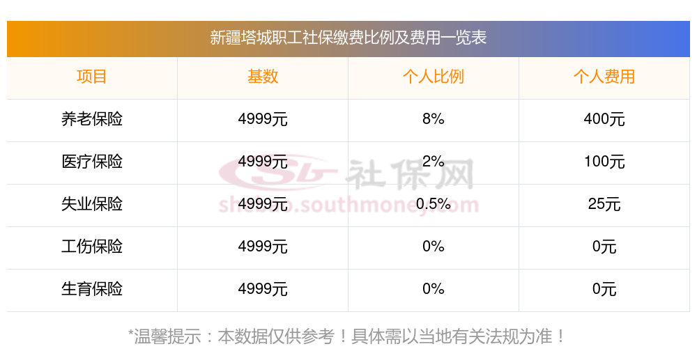 2025年新疆塔城社保缴费多少钱?下表是2024-2025年新疆塔城社保费用明细参考,新社通app-社保缴费查询工具提供的最新数据如下: