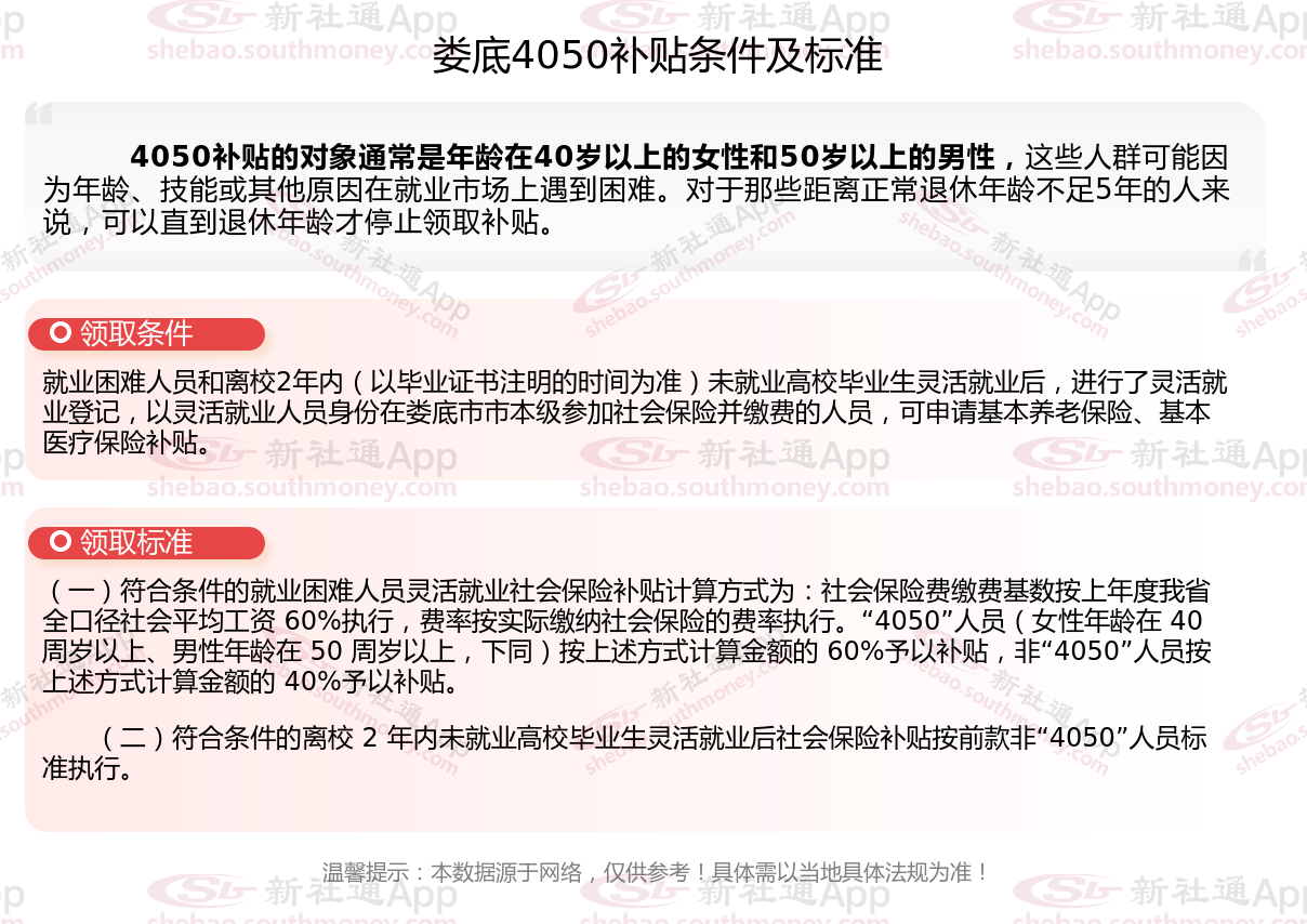 一、2025年娄底灵活就业4050社保补贴标准和条件是什么