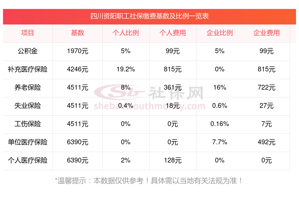 四川资阳2025年社保养老保险缴费标准是多少?下表是2025年四川资阳社保费用明细参考,新社通app-社保缴费查询工具提供的最新数据如下: