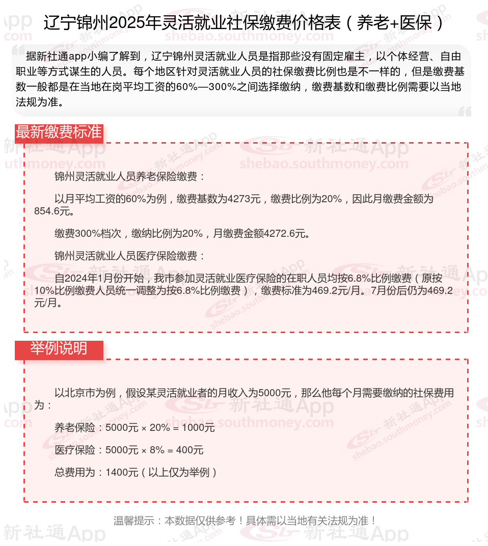 2025年辽宁锦州城镇职工社会保险缴费基数用人单位及其职工(包括有雇工的个体工商户及其雇工)分别按2024年度全口径省平的60%(4273元/月)和300%(21363元/月)核定缴费基数的下限和上限执行。
