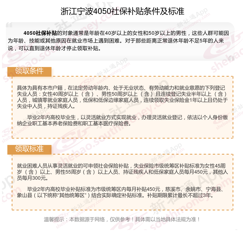 一、浙江宁波4050社保补贴标准及条件2025年最新消息