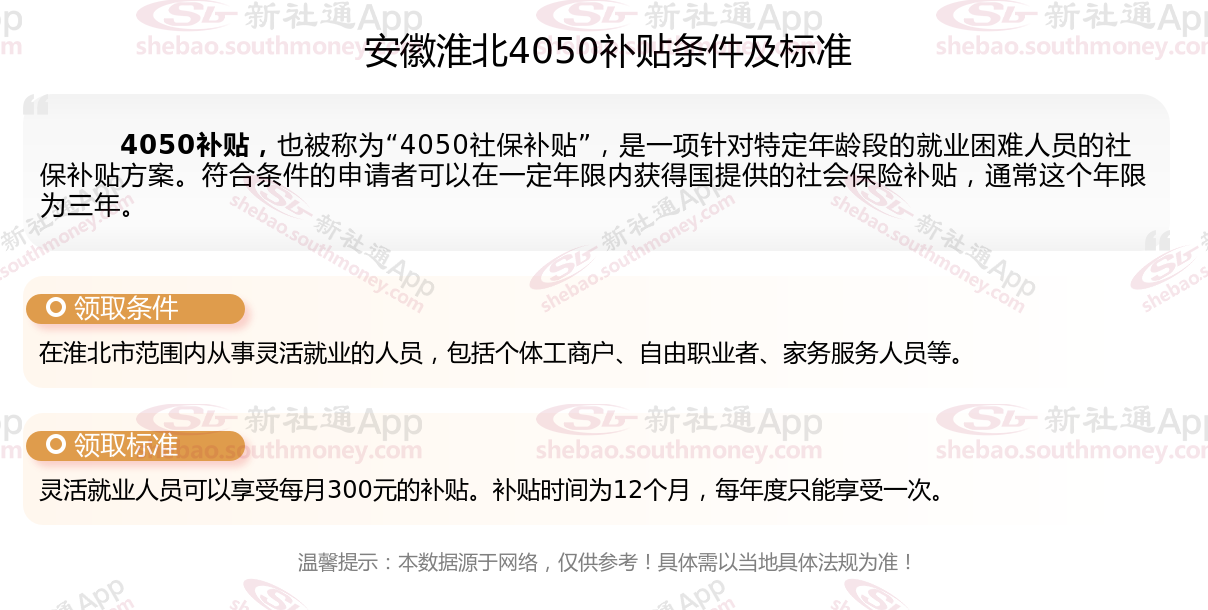 二、2025年安徽淮北4050社保补贴标准是多少?条件是什么?